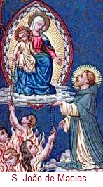 S. JOÃO DE MACIAS (1585-1645). Nascido em Ribera del Fresno na Estremadura espanhola, primeiro foi pastor na sua terra e depois, convidado a trabalhar para um proprietário rico do Peru, emigrou para a América. Conhecido pela sua piedade, dava tudo aos pobres. Aos 36 anos foi aceite nos Dominicanos onde, durante 20 anos, foi irmão porteiro e a quem ricos e pobres procuravam para aconselhamento. Era conhecido pelas suas visões e oração ininterrupta do Rosário pelas intenções das almas do purgatório. A tradição conta que a caridade e as orações de Juan de Macias terão levado ao céu mais de um milhão de almas. Foi canonizado em 1975 pelo Papa Paulo VI.