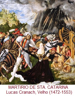 STA. CATARINA DE ALEXANDRIA (início séc. IV ?). Segundo a vida dos santos da “Legenda Dourada” foi uma cristã nobre, muito culta, que invectivou o imperador Maxêncio pela perseguição dos cristãos, debatendo com os filósofos pagãos por ele enviados para a persuadirem com os seus argumentos, e que, ao contrário, ela converteu. Depois de presa e espancada, foi condenada a morrer na roda que se quebrou quando ali a colocaram. Tudo isto enraiveceu tanto o imperador que a mandou decapitar. A sua existência, muito popular durante a idade Média, é hoje por alguns considerada lendária.
