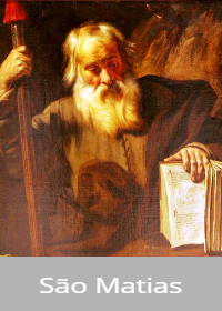 S. MATIAS Pertencia aos 72 discípulos enviados por Jesus a pregar a Boa Nova; fora discípulo dO Senhor e testemunhara a Ressurreição. Após a Ascensão, enquanto esperavam a vinda dO Espírito Santo, os Após-tolos escolheram à sorte Matias para ocupar o lugar de Judas e completar o número dos Doze, representativo das doze tribos de Israel. Segundo a tradição Matias vangelizou a Etiópia, onde sofreu o martírio. Por ordem de STAHelena, as suas relíquias foram levadas para a cidade de Tréveris, na Alemanha, de que é o padroeiro. Clemente de Alexandria conservou-nos uma sua recomendação: “É necessário combater a carne, utilizá-la ou explorá-la com a mortificação. A alma, devemos robustecê-la com a fé e o estudo”.