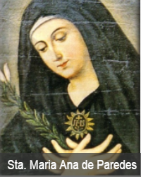 STA. MARIA ANA DE PAREDES (1618-45). Natural de Quito, ficou órfã de pai e mãe aos 6 anos, revelando desde a infância especial piedade cristã. Em 1639 entrou na Ordem Terceira Franciscana. Tinha o dom do conselho e da profecia. Após um sismo ofereceu a vida para livrar o Equador do flagelo dos tremores de terra e das epidemias. Viveu fazendo o bem a favor dos pobres, com muitos milagres, e tornou-se conhecida como “a açucena de Quito”. O Equador proclamou-a sua “Heroína nacional”.