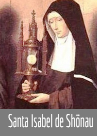STA. ISABEL DE SCHÖNAU (1129-64). Tal como a amiga STA. Hilgarda de Bingen, esta irmã beneditina foi favorecida por visões e êxtases que o irmão Eckbert transcreveu em latim. Seus escritos foram celebérrimos na Idade Média.