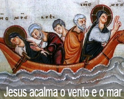 PÂNICO A BORDO (Mat.8, 23-27). Depois de uma pesada jornada em que Jesus falou às multidões, Ele aproveita a travessia do lago para recuperar um pouco. Mas, subitamente, rebenta a tempestade. As águas agitam-se com violência e as vagas entram na pequena embarcação, ameaçando afundá-la. A bordo, instala-se o pânico: os rostos ansiosos dos discípulos contrastam com o de Jesus a dormir o sono dos “justos”. Desamparados, os Apóstolos acabam por acordar O Mestre. Numa atitude que prefigura a ressurreição, Aquele que dormia levanta-Se, de pé à frente da barca. Com o Seu braço estendido, Ele invectiva as figuras monstruosas que – no alto da ilumin. do Codex Egberti simbolizam os ventos. Perante uma tal autoridade a própria figura da proa baixa as orelhas num perfil submisso. Através da humanidade de Cristo, manifesta-se a Sua divindade. A pergunta que então fazem os discípulos, também é a nossa: “Quem é este, para que até o vento e o mar lhE obedeçam?” (Marc.4,41). Jesus convida cada um de nós a passar à outra margem: “Porque estais tão assustados? Ainda não tendes fé?” (Marc.4,40). A tradução suaviza terrivelmente este texto. De facto, Mateus não hesita em escrever : “Houve no mar um grande sismo…”. O termo “terramoto” repete-se mais duas vezes no seu evangelho. No momento em que Jesus expira: “O centurião vendo o tremor de terra…”, e igualmente quando as mulheres chegam ao túmulo “houve um grande terramoto…” O sismo indica portanto, em Mateus, a intervenção de Deus que faz surgir da morte uma nova criação. É a experiência dos discípulos : ao verem que a barca ia soçobrar no abismo e no caos, suplicam : “Senhor, salva-nos !”, e Jesus de pé ressuscitado comanda o mar e os ventos, dando-lhes um mundo de paz, “uma grande calmaria”.
