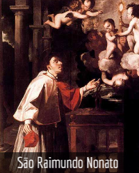 S. Raimundo Nonato, presbítero, +1240: Ingressou, com 24 anos, na Ordem dos Mercedários, destinada ao resgate de cativos. Ofereceu-se voluntariamente para ficar escravo entre os mouros, a fim de permitir a libertação de um católico que estava periclitando na fé. Visava também exercer seu ministério entre os demais pobres cativos e, mais ainda, pregar a Religião católica aos próprios maometanos. Para impedi-lo de pregar, os mouros furaram-lhe os lábios com um ferro quente, e mantinham sua boca fechada com um cadeado. Passou oito meses prisioneiro, sofrendo atrozmente. Depois de libertado, foi nomeado cardeal, em reconhecimento pelos seus méritos. Faleceu com apenas 36 anos. Recebeu o nome de Nonato (do latim “non natus”, isto é, não nascido) porque sua mãe morreu antes de dá-lo à luz e ele precisou ser extraído do corpo já inerte da mãe. É por isso invocado como padroeiro das parturientes e das parteiras.