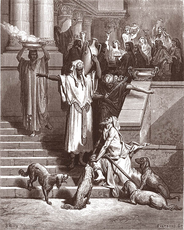 Naquele tempo, disse Jesus aos fariseus: «Havia um homem rico, que se vestia de linho fino e se banqueteava esplendidamente todos os dias. Um pobre chamado Lázaro jazia junto do seu portão, coberto de chagas. Bem desejava ele saciar-se com os restos caídos da mesa do rico; mas até os cães vinham lamber-lhe as chagas. Ora sucedeu que o pobre morreu e foi colocado pelos Anjos ao lado de Abraão. Morreu também o rico e foi sepultado. Na mansão dos mortos, estando em tormentos, levantou os olhos e viu Abraão com Lázaro a seu lado. Então ergueu a voz e disse: ‘Pai Abraão, tem compaixão de mim. Envia Lázaro, para que molhe em água a ponta do dedo e me refresque a língua, porque estou atormentado nestas chamas’. Abraão respondeu-lhe: ‘Filho, lembra-te que recebeste os teus bens em vida e Lázaro apenas os males. Por isso, agora ele encontra-se aqui consolado, enquanto tu és atormentado. Além disso, há entre nós e vós um grande abismo, de modo que, se alguém quisesse passar daqui para junto de vós, não poderia fazê-lo’. O rico exclamou: ‘Então peço-te, ó pai, que mandes Lázaro à minha casa paterna – pois tenho cinco irmãos – para que os previna, a fim de que não venham também para este lugar de tormento’. Disse-lhe Abraão: ‘Eles têm Moisés e os Profetas: que os oiçam’. Mas ele insistiu: ‘Não, pai Abraão. Se algum dos mortos for ter com eles, arrepender-se-ão’. Abraão respondeu-lhe: ‘Se não dão ouvidos a Moisés e aos Profetas, também não se deixarão convencer, se alguém ressuscitar dos mortos’».