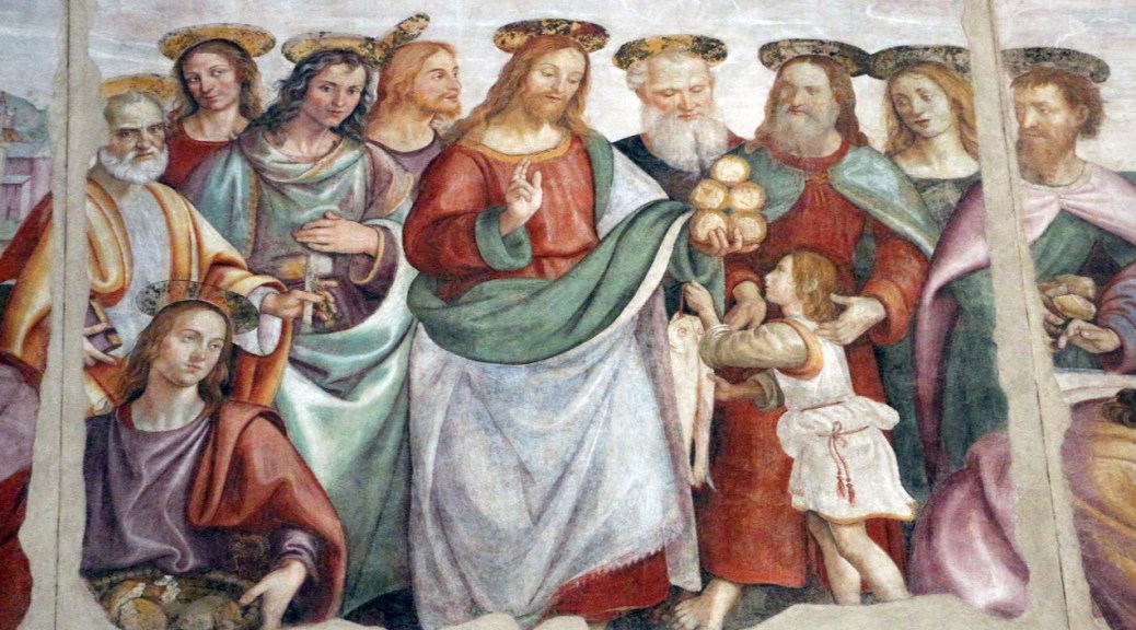 Naquele tempo, Jesus partiu para o outro lado do mar da Galileia, ou de Tiberíades. Seguia-O numerosa multidão, por ver os milagres que Ele realizava nos doentes. Jesus subiu a um monte e sentou-Se aí com os seus discípulos. Estava próxima a Páscoa, a festa dos judeus. Erguendo os olhos e vendo que uma grande multidão vinha ao seu encontro, Jesus disse a Filipe: «Onde havemos de comprar pão para lhes dar de comer?». Dizia isto para o experimentar, pois Ele bem sabia o que ia fazer. Respondeu-Lhe Filipe: «Duzentos denários de pão não chegam para dar um bocadinho a cada um». Disse-Lhe um dos discípulos, André, irmão de Simão Pedro: «Está aqui um rapazito que tem cinco pães de cevada e dois peixes. Mas que é isso para tanta gente?». Jesus respondeu: «Mandai-os sentar». Havia muita erva naquele lugar e os homens sentaram-se em número de uns cinco mil. Então, Jesus tomou os pães, deu graças e distribuiu-os aos que estavam sentados, fazendo o mesmo com os peixes; e comeram quanto quiseram. Quando ficaram saciados, Jesus disse aos discípulos: «Recolhei os bocados que sobraram, para que nada se perca». Recolheram-nos e encheram doze cestos com os bocados dos cinco pães de cevada que sobraram aos que tinham comido. Quando viram o milagre que Jesus fizera, aqueles homens começaram a dizer: «Este é, na verdade, o Profeta que estava para vir ao mundo». Mas Jesus, sabendo que viriam buscá-l’O para O fazerem rei, retirou-Se novamente, sozinho, para o monte.
