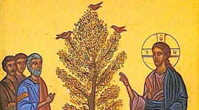 Naquele tempo, Jesus disse ainda à multidão a seguinte parábola: «O reino dos Céus pode comparar-se ao grão de mostarda que um homem tomou e semeou no seu campo. Sendo a menor de todas as sementes, depois de crescer, é a maior de todas as hortaliças e torna-se árvore, de modo que as aves do céu vêm abrigar-se nos seus ramos». Disse-lhes outra parábola: «O reino dos Céus pode comparar-se ao fermento que uma mulher toma e mistura em três medidas de farinha, até ficar tudo levedado». Tudo isto disse Jesus em parábolas, e sem parábolas nada lhes dizia, a fim de se cumprir o que fora anunciado pelo profeta, que disse: «Abrirei a minha boca em parábolas, proclamarei verdades ocultas desde a criação do mundo».