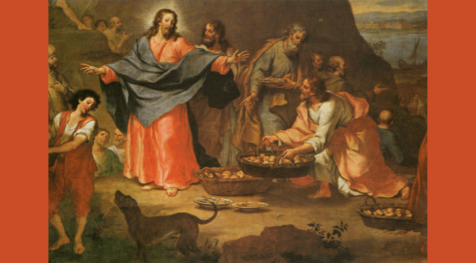 Naquele tempo, Jesus viu uma grande multidão e compadeceu-se deles, porque eram como ovelhas sem pastor. Começou então a ensiná-los demoradamente. Como a hora ia já muito adiantada, os discípulos aproximaram-se de Jesus e disseram-Lhe: «O local é deserto e a hora já vai adiantada. Manda-os embora, para irem aos casais e aldeias mais próximas comprar de comer». Jesus respondeu-lhes: «Dai-lhes vós mesmos de comer». Disseram-Lhe eles: «Havemos de ir comprar duzentos denários de pão, para lhes darmos de comer?» Jesus perguntou-lhes: «Quantos pães tendes? Ide ver». Eles foram verificar e responderam: «Temos cinco pães e dois peixes». Ordenou-lhes então que os fizessem sentar a todos, por grupos, sobre a verde relva. Eles sentaram-se, repartindo-se em grupos de cem e de cinquenta. Jesus tomou os cinco pães e os dois peixes, ergueu os olhos ao Céu e pronunciou a bênção. Depois partiu os pães e foi-os dando aos discípulos, para que eles os distribuíssem. Repartiu por todos também os peixes. Todos comeram até ficarem saciados; e encheram ainda doze cestos com os pedaços de pão e de peixe. Os que comeram dos pães eram cinco mil homens.