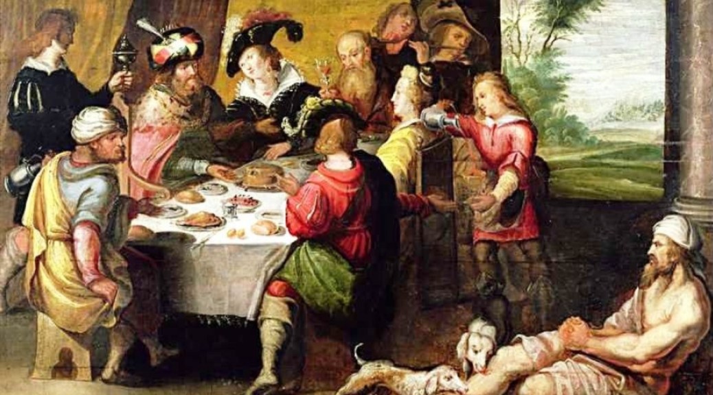 Naquele tempo, disse Jesus aos fariseus: «Havia um homem rico, que se vestia de linho fino e se banqueteava esplendidamente todos os dias. Um pobre chamado Lázaro jazia junto do seu portão, coberto de chagas. Bem desejava ele saciar-se com os restos caídos da mesa do rico; mas até os cães vinham lamber-lhe as chagas. Ora sucedeu que o pobre morreu e foi colocado pelos Anjos ao lado de Abraão. Morreu também o rico e foi sepultado. Na mansão dos mortos, estando em tormentos, levantou os olhos e viu Abraão com Lázaro a seu lado. Então ergueu a voz e disse: ‘Pai Abraão, tem compaixão de mim. Envia Lázaro, para que molhe em água a ponta do dedo e me refresque a língua, porque estou atormentado nestas chamas’. Abraão respondeu-lhe: ‘Filho, lembra-te que recebeste os teus bens em vida e Lázaro apenas os males. Por isso, agora ele encontra-se aqui consolado, enquanto tu és atormentado. Além disso, há entre nós e vós um grande abismo, de modo que, se alguém quisesse passar daqui para junto de vós, não poderia fazê-lo’. O rico exclamou: ‘Então peço-te, ó pai, que mandes Lázaro à minha casa paterna – pois tenho cinco irmãos – para que os previna, a fim de que não venham também para este lugar de tormento’. Disse-lhe Abraão: ‘Eles têm Moisés e os Profetas: que os oiçam’. Mas ele insistiu: ‘Não, pai Abraão. Se algum dos mortos for ter com eles, arrepender-se-ão’. Abraão respondeu-lhe: ‘Se não dão ouvidos a Moisés e aos Profetas, também não se deixarão convencer, se alguém ressuscitar dos mortos’».