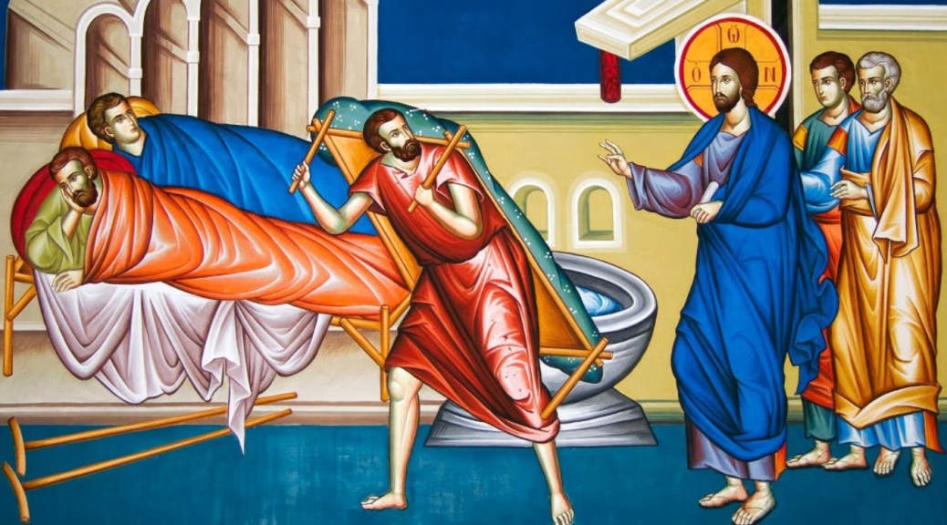 Naquele tempo, por ocasião de uma festa dos judeus, Jesus subiu a Jerusalém. Existe em Jerusalém, junto à porta das ovelhas, uma piscina, chamada, em hebraico, Betsatá, que tem cinco pórticos. Ali jazia um grande número de enfermos, cegos, coxos e paralíticos. Estava ali também um homem, enfermo havia trinta e oito anos. Ao vê-lo deitado e sabendo que estava assim há muito tempo, Jesus perguntou-lhe: «Queres ser curado?» O enfermo respondeu-Lhe: «Senhor, não tenho ninguém que me introduza na piscina, quando a água é agitada; enquanto eu vou, outro desce antes de mim». Disse-lhe Jesus: «Levanta-te, toma a tua enxerga e anda». No mesmo instante o homem ficou são, tomou a sua enxerga e começou a caminhar. Ora aquele dia era sábado. Diziam os judeus àquele que tinha sido curado: «Hoje é sábado: não podes levar a tua enxerga». Mas ele respondeu-lhes: «Aquele que me curou disse-me: ‘Toma a tua enxerga e anda’». Perguntaram-lhe então: «Quem é que te disse: ‘Toma a tua enxerga e anda’». Mas o homem que tinha sido curado não sabia quem era, porque Jesus tinha-Se afastado da multidão que estava naquele local. Mais tarde, Jesus encontrou-o no templo e disse-lhe: «Agora estás são. Não voltes a pecar, para que não te suceda coisa pior». O homem foi então dizer aos judeus que era Jesus quem o tinha curado. Desde então os judeus começaram a perseguir Jesus, por fazer isto num dia de sábado.