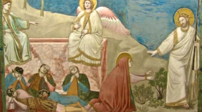 Naquele tempo, Maria Madalena estava a chorar junto do sepulcro. Enquanto chorava, debruçou-se para dentro do sepulcro e viu dois Anjos vestidos de branco, sentados, um à cabeceira e outro aos pés, onde estivera deitado o corpo de Jesus. Os Anjos perguntaram a Maria: «Mulher, porque choras?» Ela respondeu- lhes: «Porque levaram o meu Senhor e não sei onde O puseram». Dito isto, voltou-se para trás e viu Jesus de pé, sem saber que era Ele. Disse-lhe Jesus: «Mulher, porque choras? A quem procuras?» Pensando que era o jardineiro, ela respondeu-Lhe: «Senhor, se foste tu que O levaste, diz-me onde O puseste, para eu O ir buscar». Disse-lhe Jesus: «Maria!» Ela voltou-se e respondeu em hebraico: «Rabuni!», que quer dizer: «Mestre!» Jesus disse-lhe: «Não Me detenhas, porque ainda não subi para o Pai. Vai ter com os meus irmãos e diz-lhes que vou subir para o meu Pai e vosso Pai, para o meu Deus e vosso Deus». Maria Madalena foi anunciar aos discípulos: «Vi o Senhor». E contou-lhes o que Ele lhe tinha dito.