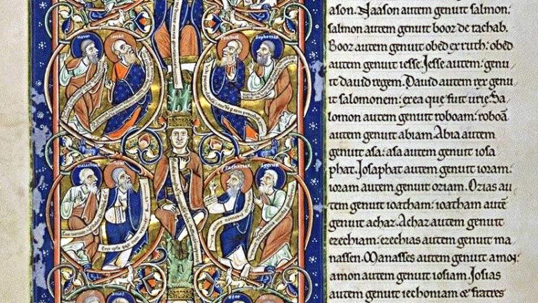 Genealogia de Jesus Cristo, Filho de David, Filho de Abraão: Abraão gerou Isaac; Isaac gerou Jacob; Jacob gerou Judá e seus irmãos. Judá gerou, de Tamar, Farés e Zara; Farés gerou Esrom; Esrom gerou Arão; Arão gerou Aminadab; Aminadab gerou Naasson; Naasson gerou Salmon; Salmon gerou, de Raab, Booz; Booz gerou, de Rute, Obed; Obed gerou Jessé; Jessé gerou o rei David. David, da mulher de Urias, gerou Salomão; Salomão gerou Roboão; Roboão gerou Abias; Abias gerou Asa; Asa gerou Josafat; Josafat gerou Jorão; Jorão gerou Ozias; Ozias gerou Joatão; Joatão gerou Acaz; Acaz gerou Ezequias; Ezequias gerou Manassés; Manassés gerou Amon; Amon gerou Josias; Josias gerou Jeconias e seus irmãos, ao tempo do desterro de Babilónia. Depois do desterro de Babilónia, Jeconias gerou Salatiel; Salatiel gerou Zorobabel; Zorobabel gerou Abiud; Abiud gerou Eliacim; Eliacim gerou Azor; Azor gerou Sadoc; Sadoc gerou Aquim; Aquim gerou Eliud; Eliud gerou Eleazar; Eleazar gerou Matã; Matã gerou Jacob; Jacob gerou José, esposo de Maria, da qual nasceu Jesus, chamado Cristo. Assim, todas estas gerações são: de Abraão a David, catorze gerações; de David ao desterro de Babilónia, catorze gerações; do desterro de Babilónia até Cristo, catorze gerações.
