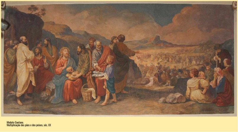Naquele tempo, Jesus viu uma grande multidão e compadeceu-se deles, porque eram como ovelhas sem pastor. Começou então a ensiná-los demoradamente. Como a hora ia já muito adiantada, os discípulos aproximaram-se de Jesus e disseram-Lhe: «O local é deserto e a hora já vai adiantada. Manda-os embora, para irem aos casais e aldeias mais próximas comprar de comer». Jesus respondeu-lhes: «Dai-lhes vós mesmos de comer». Disseram-Lhe eles: «Havemos de ir comprar duzentos denários de pão, para lhes darmos de comer?» Jesus perguntou-lhes: «Quantos pães tendes? Ide ver». Eles foram verificar e responderam: «Temos cinco pães e dois peixes». Ordenou-lhes então que os fizessem sentar a todos, por grupos, sobre a verde relva. Eles sentaram-se, repartindo-se em grupos de cem e de cinquenta. Jesus tomou os cinco pães e os dois peixes, ergueu os olhos ao Céu e pronunciou a bênção. Depois partiu os pães e foi-os dando aos discípulos, para que eles os distribuíssem. Repartiu por todos também os peixes. Todos comeram até ficarem saciados; e encheram ainda doze cestos com os pedaços de pão e de peixe. Os que comeram dos pães eram cinco mil homens.