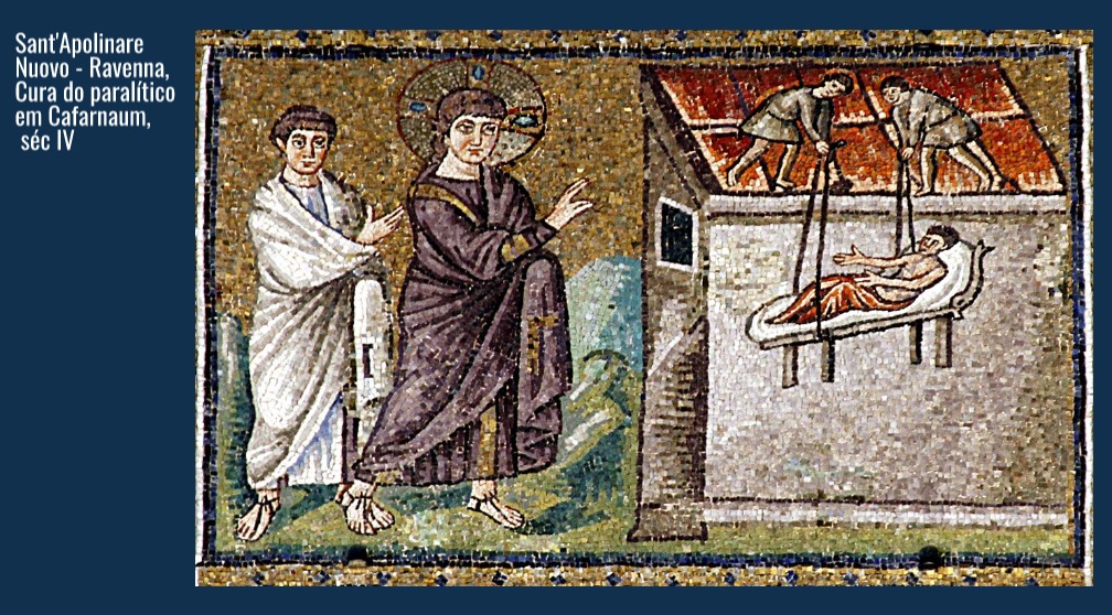 Quando Jesus entrou de novo em Cafarnaum e se soube que Ele estava em casa, juntaram-se tantas pessoas que já não cabiam sequer em frente da porta; e Jesus começou a pregar-lhes a palavra. Trouxeram-Lhe um paralítico, transportado por quatro homens; e, como não podiam levá-lo até junto d’Ele, devido à multidão, descobriram o tecto, por cima do lugar onde Ele Se encontrava e, feita assim uma abertura, desceram a enxerga em que jazia o paralítico. Ao ver a fé daquela gente, Jesus disse ao paralítico: «Filho, os teus pecados estão perdoados». Estavam ali sentados alguns escribas, que assim discorriam em seus corações: «Porque fala Ele deste modo? Está a blasfemar. Não é só Deus que pode perdoar os pecados?». Jesus, percebendo o que eles estavam a pensar, perguntou-lhes: «Porque pensais assim nos vossos corações? Que é mais fácil? Dizer ao paralítico ‘Os teus pecados estão perdoados’ ou dizer ‘Levanta-te, toma a tua enxerga e anda’? Pois bem. Para saberdes que o Filho do homem tem na terra o poder de perdoar os pecados, ‘Eu te ordeno – disse Ele ao paralítico – levanta-te, toma a tua enxerga e vai para casa’». O homem levantou-se, tomou a enxerga e saiu diante de toda a gente, de modo que todos ficaram maravilhados e glorificavam a Deus, dizendo: «Nunca vimos coisa assim».