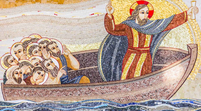 Naquele dia, ao cair da tarde, Jesus disse aos seus discípulos: «Passemos à outra margem do lago». Eles deixaram a multidão e levaram Jesus consigo na barca em que estava sentado. Iam com Ele outras embarcações. Levantou-se então uma grande tormenta e as ondas eram tão altas que enchiam a barca de água. Jesus, à popa, dormia com a cabeça numa almofada. Eles acordaram-n’O e disseram: «Mestre, não Te importas que pereçamos?». Jesus levantou-Se, falou ao vento imperiosamente e disse ao mar: «Cala-te e está quieto». O vento cessou e fez-se grande bonança. Depois disse aos discípulos: «Porque estais tão assustados? Ainda não tendes fé?». Eles ficaram cheios de temor e diziam uns para os outros: «Quem é este homem, que até o vento e o mar Lhe obedecem?».