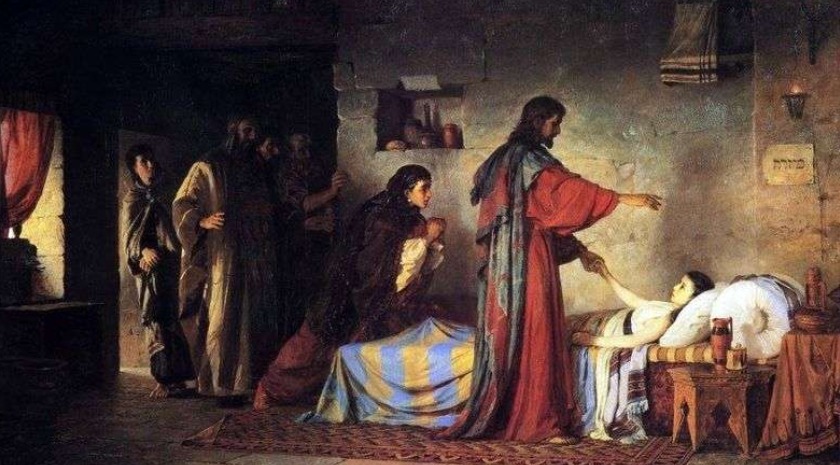 Naquele tempo, depois de Jesus ter atravessado de barco para a outra margem do lago, reuniu-se uma grande multidão à sua volta, e Ele deteve-Se à beira-mar. Chegou então um dos chefes da sinagoga, chamado Jairo. Ao ver Jesus, caiu a seus pés e suplicou-Lhe com insistência: «A minha filha está a morrer. Vem impor-lhe as mãos, para que se salve e viva». Jesus foi com ele, seguido por grande multidão, que O apertava de todos os lados. Entretanto, vieram dizer da casa do chefe da sinagoga: «A tua filha morreu. Porque estás ainda a importunar o Mestre?». Mas Jesus, ouvindo estas palavras, disse ao chefe da sinagoga: «Não temas; basta que tenhas fé». E não deixou que ninguém O acompanhasse, a não ser Pedro, Tiago e João, irmão de Tiago. Quando chegaram a casa do chefe da sinagoga, Jesus encontrou grande alvoroço, com gente que chorava e gritava. Ao entrar, perguntou-lhes: «Porquê todo este alarido e tantas lamentações? A menina não morreu; está a dormir». Riram-se d’Ele. Jesus, depois de os ter mandado sair a todos, levando consigo apenas o pai da menina e os que vinham com Ele, entrou no local onde jazia a menina, pegou-lhe na mão e disse: «Talita Kum», que significa: «Menina, Eu te ordeno: Levanta-te». Ela ergueu-se imediatamente e começou a andar, pois já tinha doze anos. Ficaram todos muito maravilhados. Jesus recomendou-lhes insistentemente que ninguém soubesse do caso e mandou dar de comer à menina.