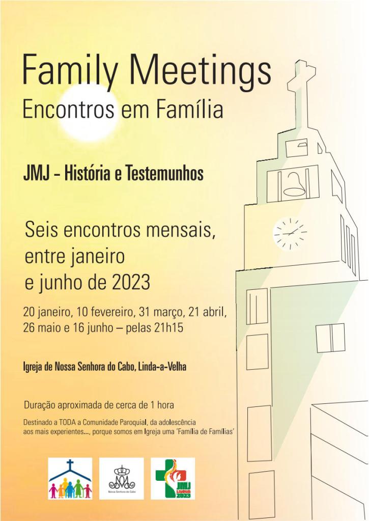 A equipa da pastoral familiar da Paróquia de Linda-a-Velha organiza os “encontros em família”, sobre a jornada Mundial da Juventude, com a apresentação da história da jornada e convidados que dão testemunho. São seis encontros, sempre às 21h15 na Igreja Paroquial. O primeiro é no dia 20 de janeiro. Os seguintes, a 10 de fevereiro, 31 de março, 21 de abril, 26 de maio e 16 de junho.
