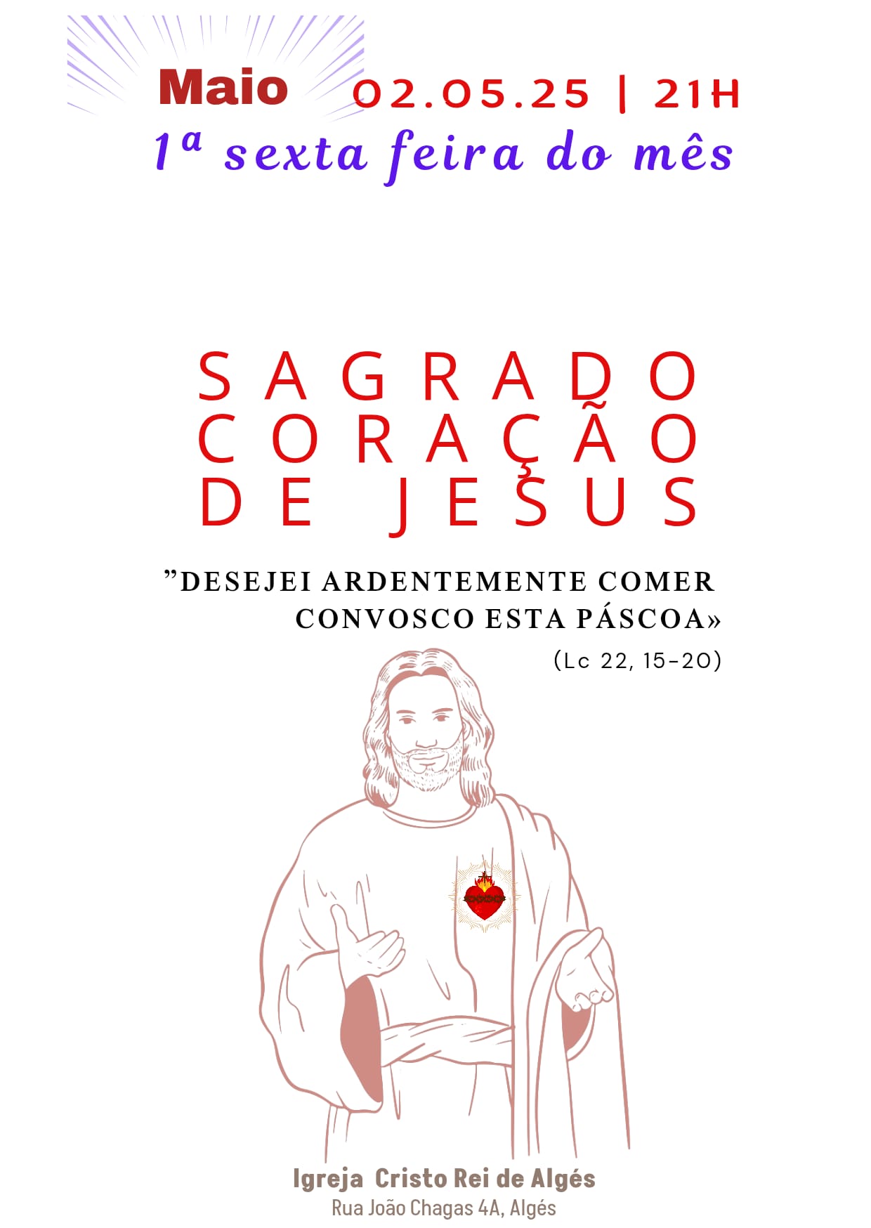 A Igreja Paroquial Cristo Rei de Algés realiza na primeira sexta-feira de maio, dia 2, às 21h, a Oração de desagravo ao Sagrado Coração de Jesus.