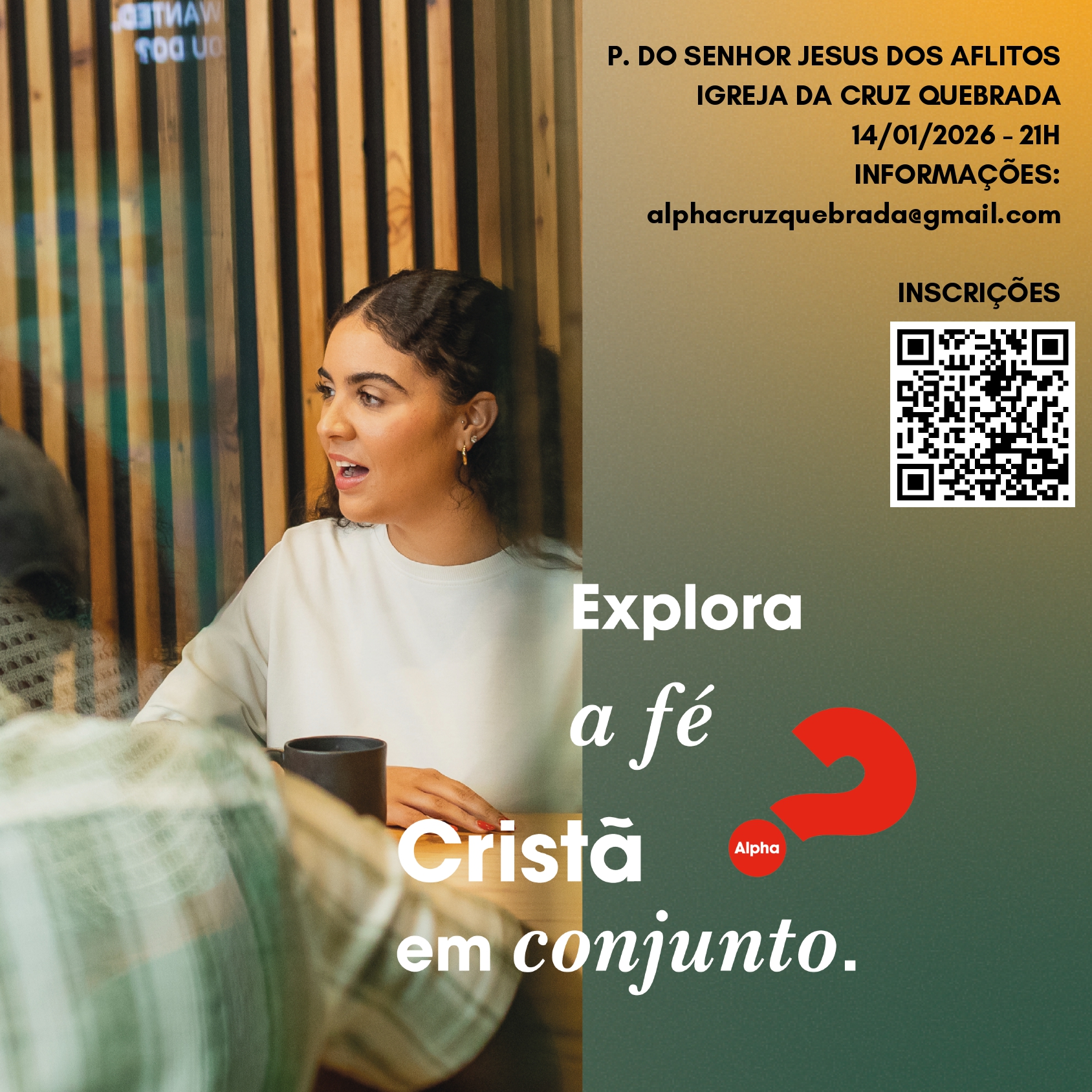O Curso Alpha inicia as suas atividades de 2026 no dia 14 de janeiro, às 21h, com a primeira sessão a acontecer na Igreja Paroquial do Senhor Jesus dos Aflitos, na Cruz Quebrada-Dafundo. Ao todo, serão 11 sessões com duração de 1h30 minutos, voltada à exploração da fé, a vida e o seu sentido num ambiente amigável, aberto e informal.