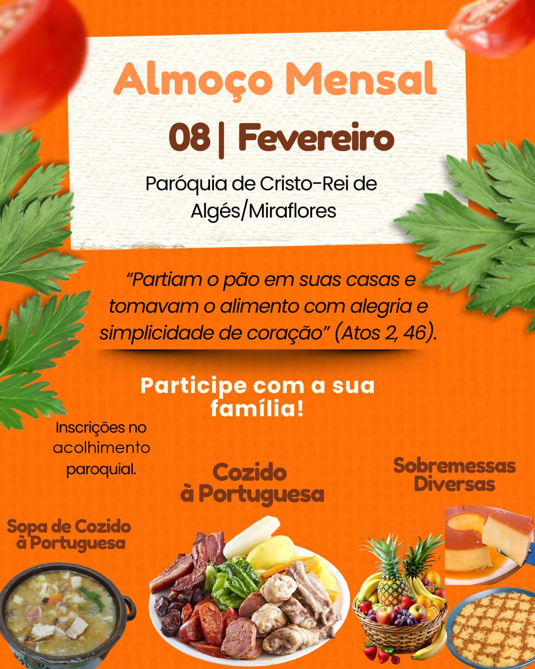Devido ao encerramento da visita Pastoral, o almoço paroquial no mês de Fevereiro será no Domingo dia 8, a seguir à Santa Missa em Miraflores, às 12h15.