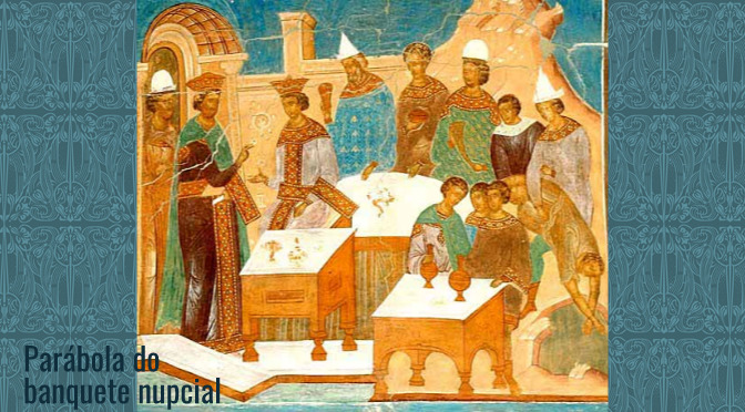 Naquele tempo, Jesus dirigiu-Se de novo aos príncipes dos sacerdotes e aos anciãos do povo e, falando em parábolas, disse-lhes: «O reino dos Céus pode comparar-se a um rei que preparou um banquete nupcial para o seu filho. Mandou os servos chamar os convidados para as bodas, mas eles não quiseram vir. Mandou ainda outros servos, ordenando-lhes: ‘Dizei aos convidados: Preparei o meu banquete, os bois e cevados foram abatidos, tudo está pronto. Vinde às bodas’. Mas eles, sem fazerem caso, foram um para o seu campo e outro para o seu negócio; os outros apoderaram-se dos servos, trataram-nos mal e mataram-nos. O rei ficou muito indignado e enviou os seus exércitos, que acabaram com aqueles assassinos e incendiaram a cidade. Disse então aos servos: ‘O banquete está pronto, mas os convidados não eram dignos. Ide às encruzilhadas dos caminhos e convidai para as bodas todos os que encontrardes’. Então os servos, saindo pelos caminhos, reuniram todos os que encontraram, maus e bons. E a sala do banquete encheu-se de convidados. O rei, quando entrou para ver os convidados, viu um homem que não estava vestido com o traje nupcial e disse-lhe: ‘Amigo, como entraste aqui sem o traje nupcial?’. Mas ele ficou calado. O rei disse então aos servos: ‘Amarrai-lhe os pés e as mãos e lançai-o às trevas exteriores; aí haverá choro e ranger de dentes’. Na verdade, muitos são os chamados, mas poucos os escolhidos».