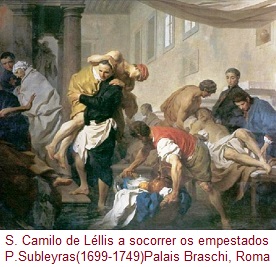 S. CAMILO DE LÉLLIS (1550-1614). Orfão desde o berço, viveu até aos 25 anos uma vida de libertino e jogador ao ponto de ter de mendigar. Chagas nos pés levaram-no ao hospital durante 4 anos, onde conviveu com S.Filipe de Néri. Foi ao ver a forma negligente como os assalariados tratavam os doentes que teve a idéia de fundar a “Congregação dos Ministros dos Enfermos” que também prestassem assistência corporal e espiritual aos do-entes em casas particulares. O tratamento dos empestados em Nápoles e Roma foram a prova de fogo destes religiosos enfermeiros que, dizia S.Camilo de Léllis, deviam ter sempre “as mãos empapadas de caridade”.