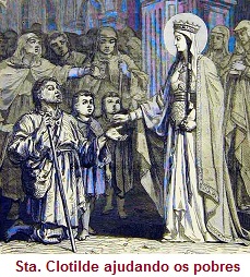 STA. CLOTILDE, RAINHA DE FRANÇA (545). Mulher de Clóvis, rei de França, desempenhou um papel importante na conversão do marido. Após a morte do rei, as guerras entre os filhos levaram-na a retirar-se para Tours, junto do túmulo de S.Martinho, em oração e penitências.