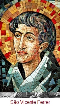 S. VICENTE FERRER (1350-1419). Dominicano espanhol, viveu no tempo da infeliz cisão religiosa do Ocidente. Morreu em Vannes (Bretanha) depois de ter percorrido os cami- nhos de Espanha, Itália e França, exortando os seus contemporâneos a uma penitên-cia radical e a uma conversão imediata. Seu lema era “Temei a Deus e dai-lhE honra”.