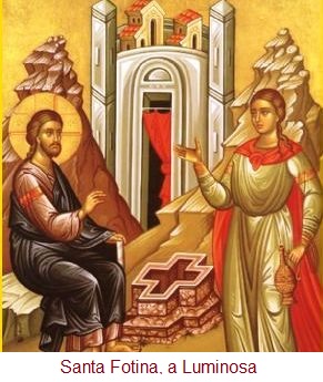 STA. FOTINA (mesma raiz de PHOTOS, «luz», ou seja, a «Luminosa») (séc.I). Na tradição grega, ela é a Samaritana do Evangelho de S. João (4,11-42), aquela que encontrou Jesus no poço de Jacob. Terá sofrido o martírio em Roma, no tempo do imperador Nero, juntamente com os seus dois filhos José e Victor.