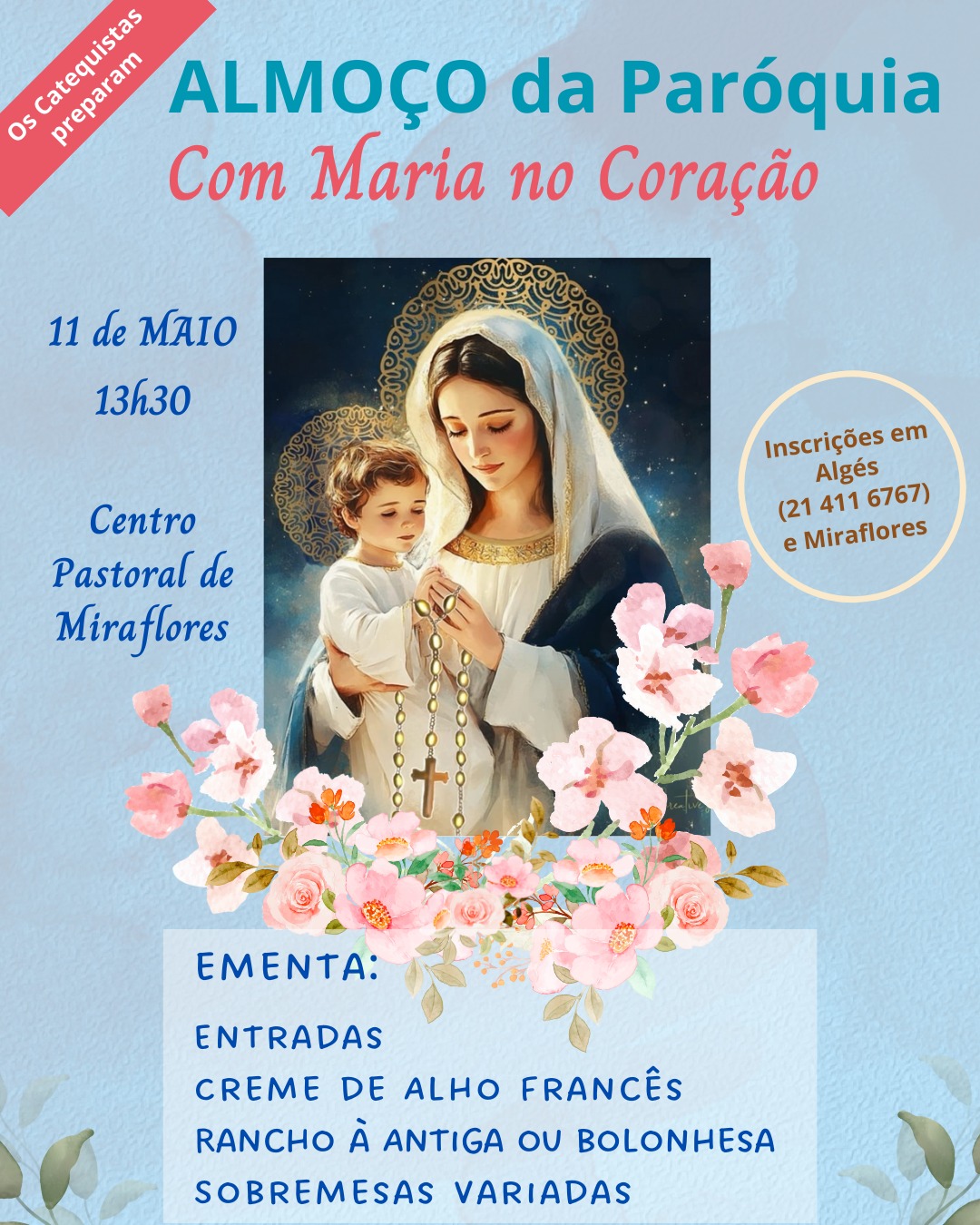Desta vez a preparação foi confiada aos catequistas. A ementa contará com entradas, creme de alho francês, rancho à antigo ou bolonhesa e sobremesas variadas.