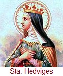 STA. HEDVIGES (1243). Esposa, muito jovem, de Henrique duque da Polónia e da Silésia, foi mãe de 6 filhos que educou no temor de Deus. Viúva, perdeu também o filho mais velho na guerra contra os Tártaros. Retirou-se para o convento, onde viveu como a última das monjas, numa grande devoção à Paixão de Cristo. Taumaturga, é a Padroeira da Polónia.