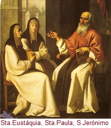 STA. EUSTÁQUIA (418). Filha de STA. Paula, seguiu o ensino de S. Jerónimo após o regresso deste a Roma. Acompanhou a mãe com S. Jerónimo numa visita à Terra Santa e sucedeu-lhe à frente do mosteiro-hospital que tinham construido em Belém.