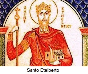 STO. ETELBERTO (552-616). Santo Etelberto, rei de Kent, foi o primeiro monarca britânico cristão. Pagão, converteu-se graças à mulher, Berta, que era cristã apaixonada. Assim, quando STOAgostinho, futuro arcebispo de Cantuária, chegou à Britânia para a evangelizar, o coração do rei estava preparado para receber Cristo. Teve papel decisivo na propagação do cristianismo entre os saxões e na promulgação de leis mais justas e na fundação de catedrais e mosteiros, e, apesar de muitos territórios terem depois voltado ao paganismo, a sua influência permaneceu.