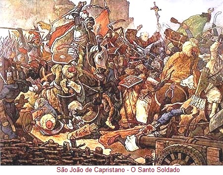 S. JOÃO DE CAPISTRANO (1386-1456). Apóstolo da Itália, com S.Bernardino de Sena seu grande amigo, este ex-advogado e franciscano, foi nomeado por Nicolau V, “núncio” apostólico da Alemanha, Boémia, Polónia e Hungria. Apesar de duas tentativas de envenenamento, congregou a cristandade no combate a Maomé ll, terror da Europa e açoite de Deus para castigo das culpas dos cristãos, que, em 1456, viera cercar Belgrado. Antes da batallha ele percorreu as fileiras do exército dos cristãos exortando-os com o crucifixo na mão, e estes, apesar do menor número, venceram. Ficou conhecido como “o santo soldado”.