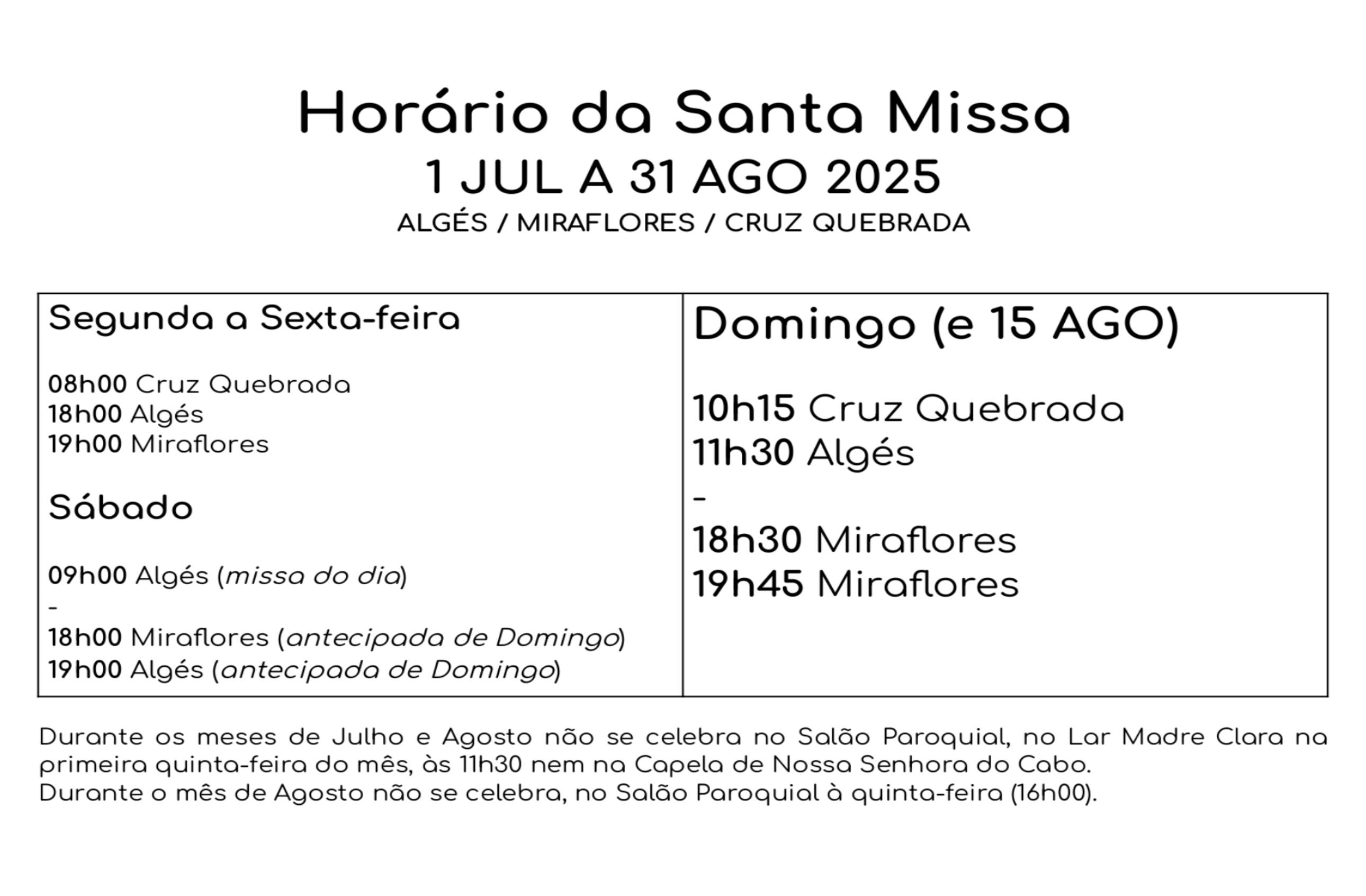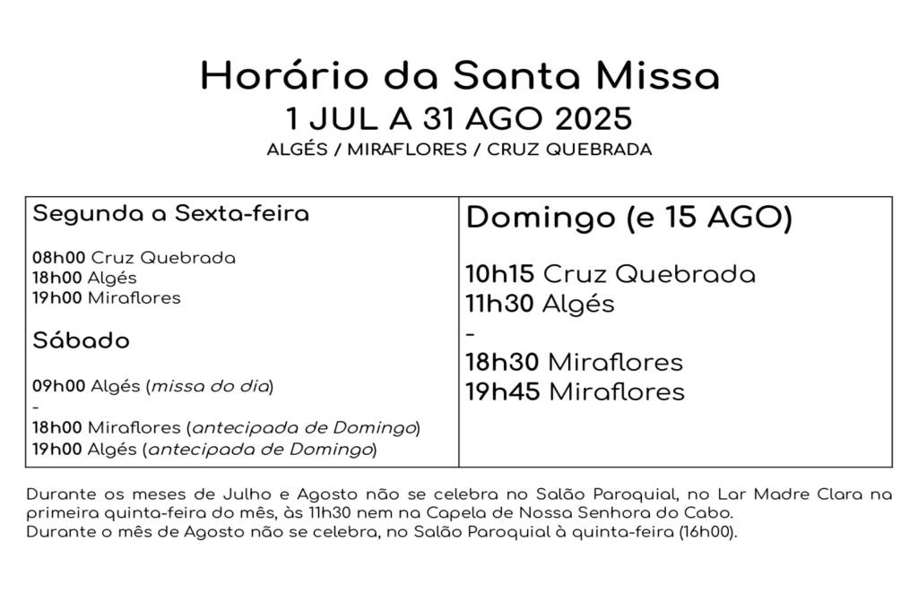Horário das Santas Missas nos meses de Julho e Agosto de 2025